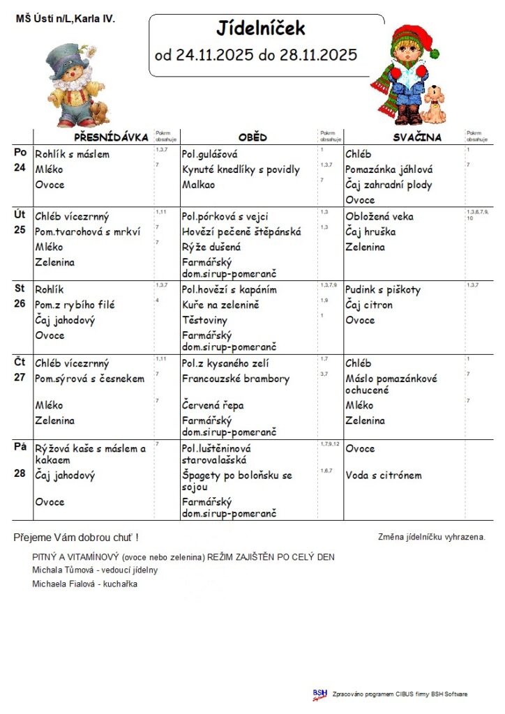 Konkrétní druh ovoce a zeleniny vyvěšen v šatně MŠ v den výdeje. Alergeny naleznete zde.
