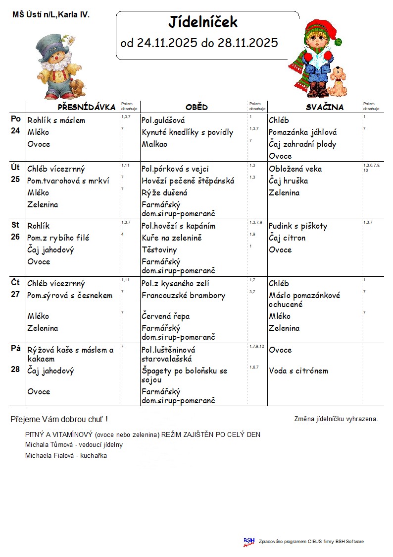 Konkrétní druh ovoce a zeleniny vyvěšen v šatně MŠ v den výdeje. Alergeny: https://mskarla4.cz/2015/03/27/alergeny/