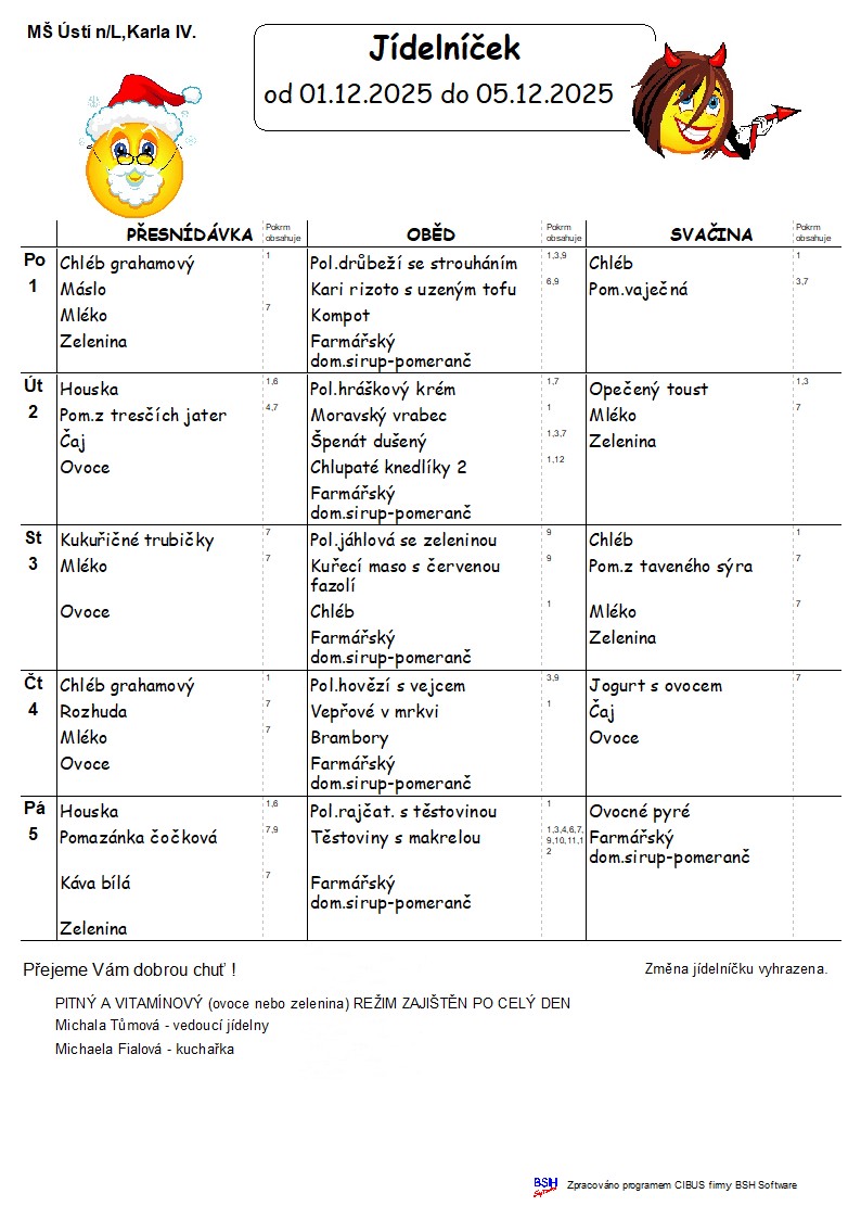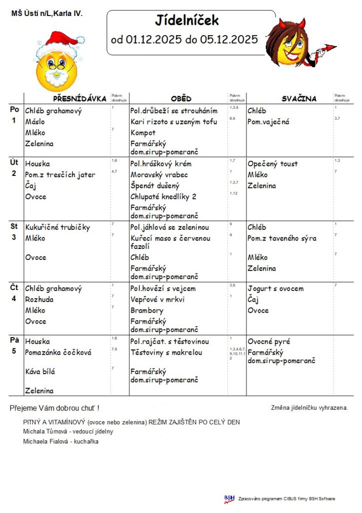 Konkrétní druh ovoce a zeleniny vyvěšen v šatně MŠ v den výdeje. Alergeny naleznete zde.