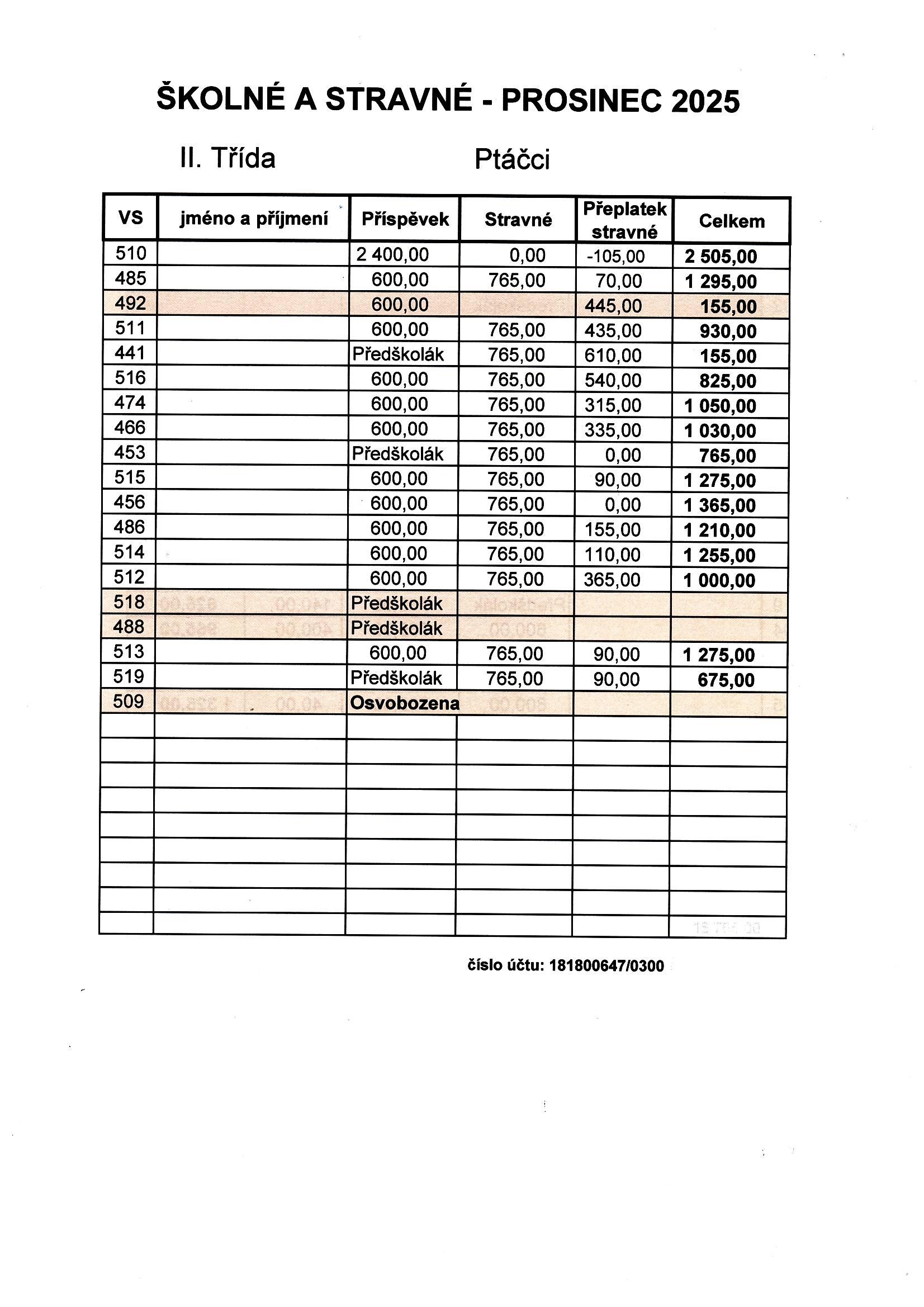 !!! Žádáme rodiče, aby dodržovali předepsanou částku a respektovali datum,