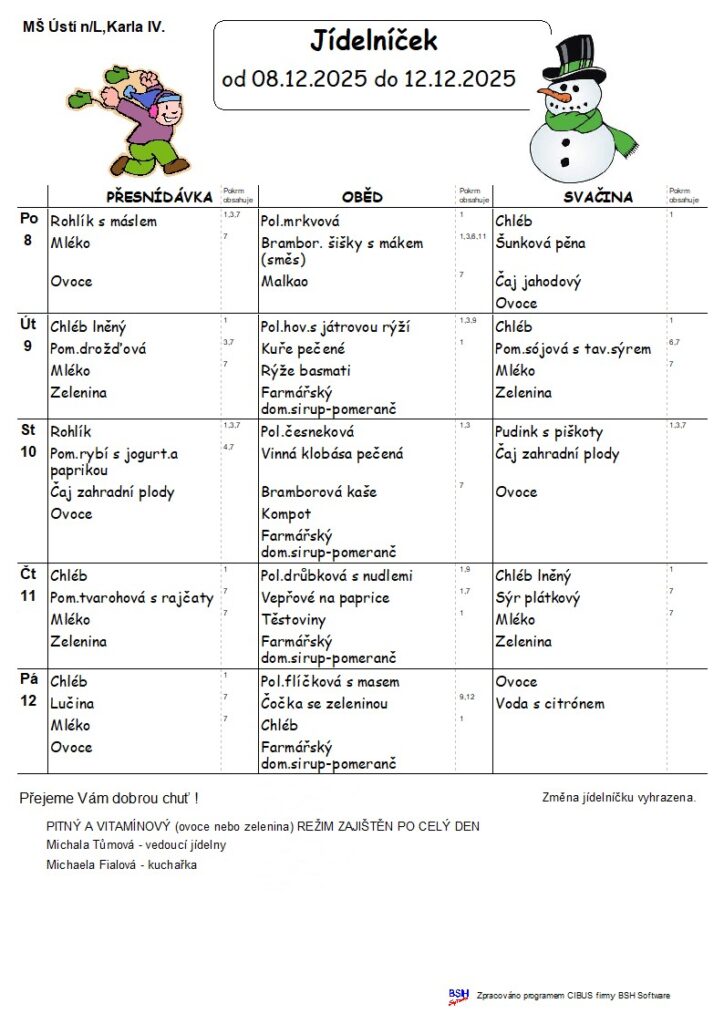 Konkrétní druh ovoce a zeleniny vyvěšen v šatně MŠ v den výdeje. Alergeny naleznete zde.
