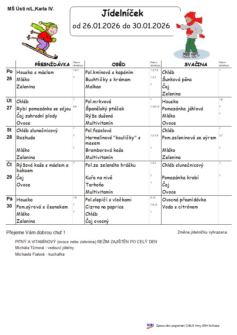 Konkrétní druh ovoce a zeleniny vyvěšen v šatně MŠ v den výdeje. Alergeny naleznete zde.