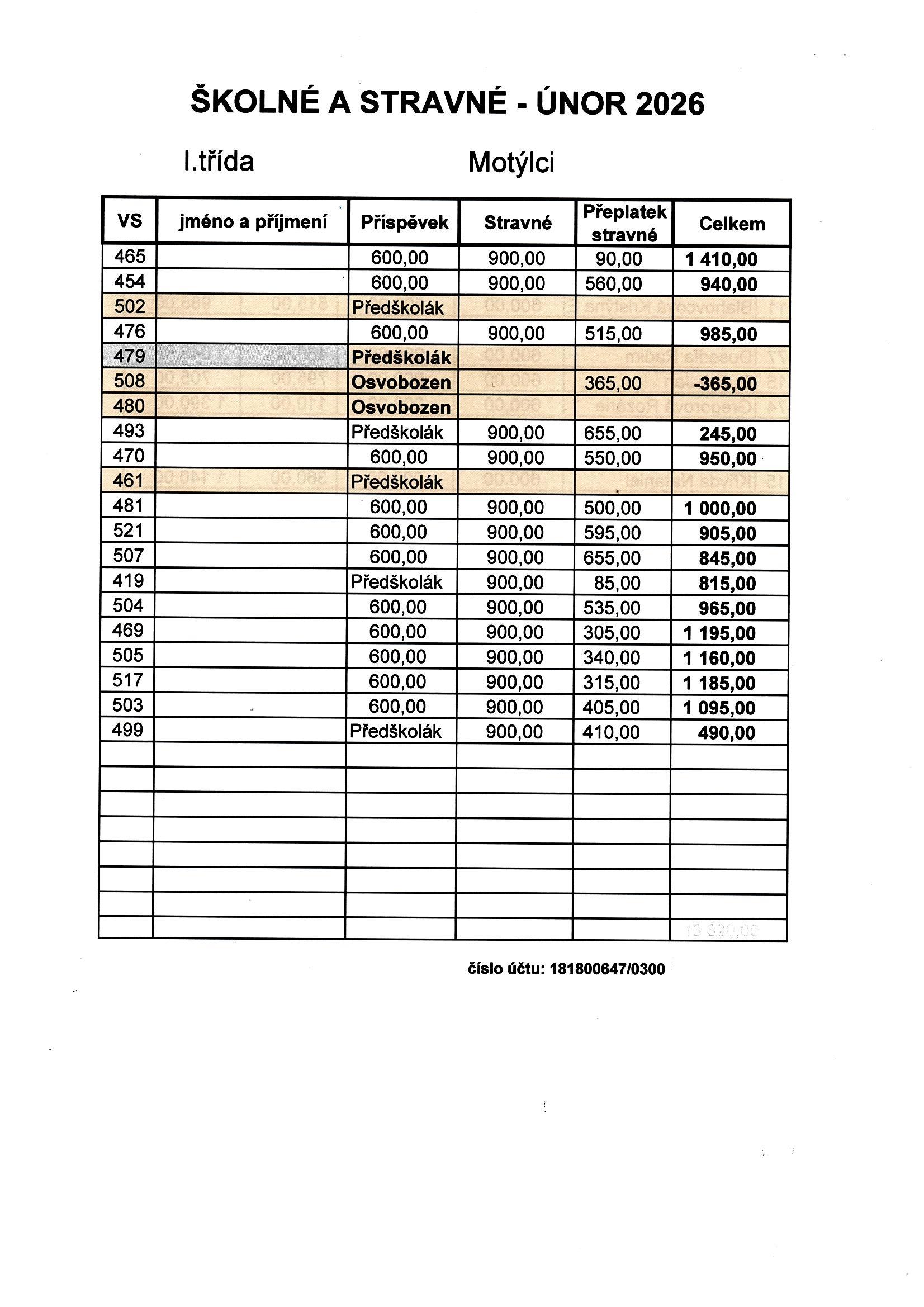 !!! Žádáme rodiče, aby dodržovali předepsanou částku a respektovali datum,