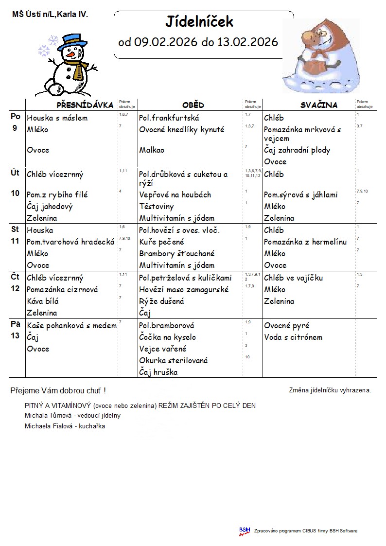 Konkrétní druh ovoce a zeleniny vyvěšen v šatně MŠ v den výdeje. Alergeny naleznete zde.