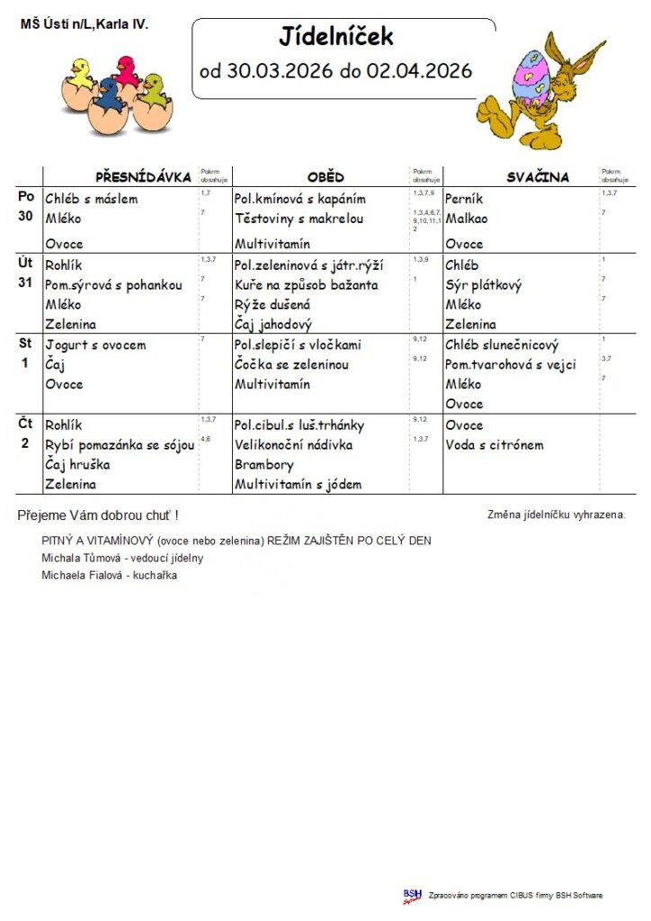 Konkrétní druh ovoce a zeleniny vyvěšen v šatně MŠ v den výdeje. Alergeny: https://mskarla4.cz/2015/03/27/alergeny/