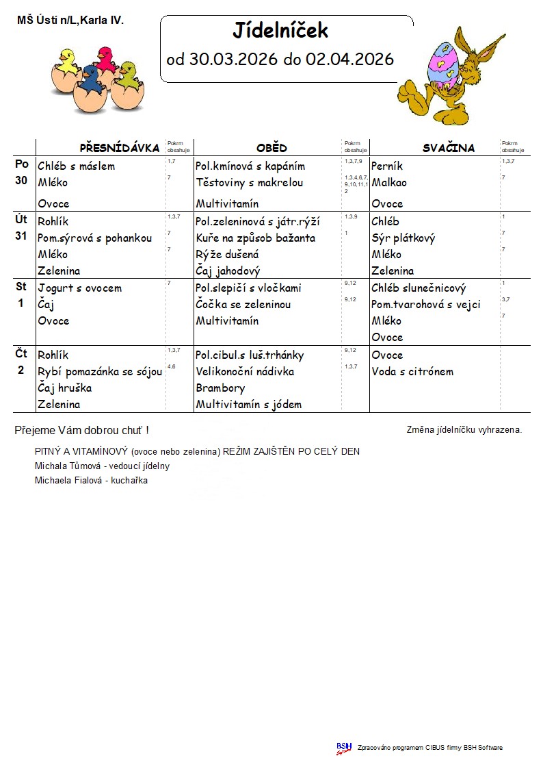 Konkrétní druh ovoce a zeleniny vyvěšen v šatně MŠ v den výdeje. Alergeny: https://mskarla4.cz/2015/03/27/alergeny/