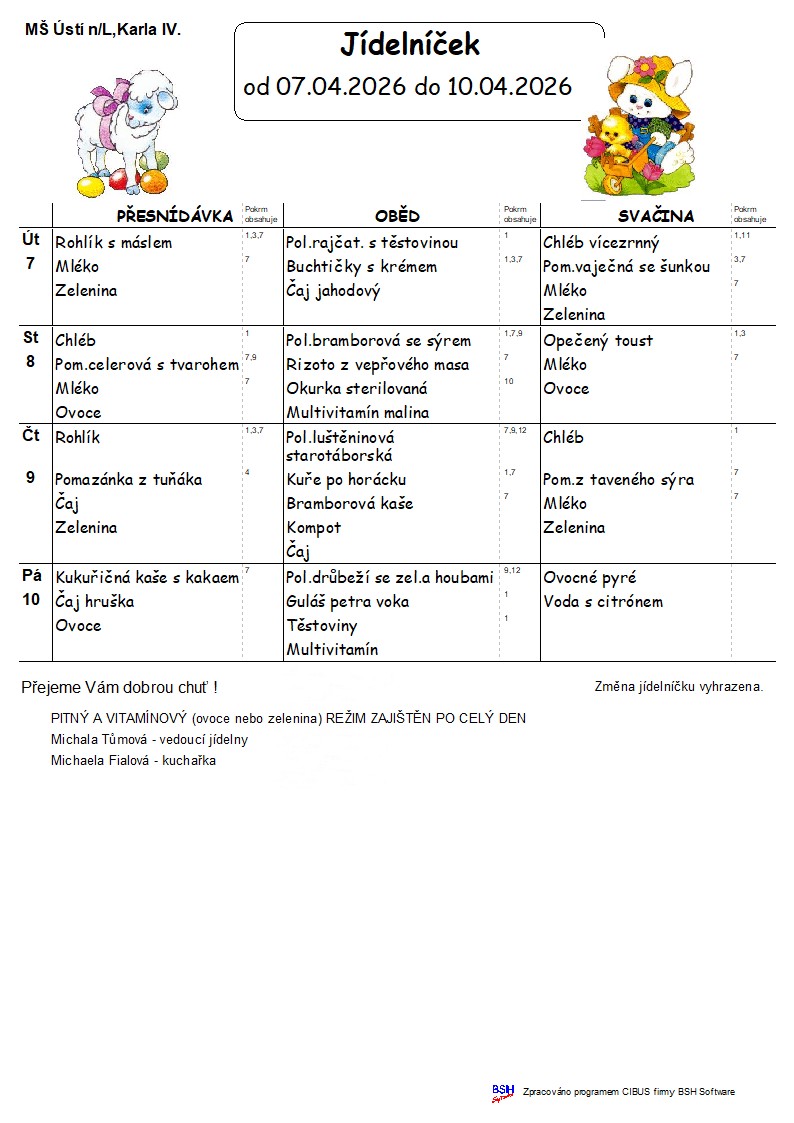 Konkrétní druh ovoce a zeleniny vyvěšen v šatně MŠ v den výdeje. Alergeny: https://mskarla4.cz/2015/03/27/alergeny/