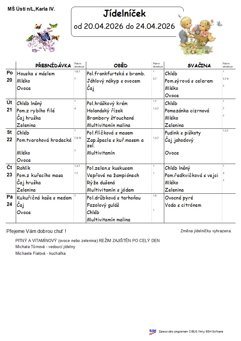 Konkrétní druh ovoce a zeleniny vyvěšen v šatně MŠ v den výdeje. Alergeny naleznete zde.